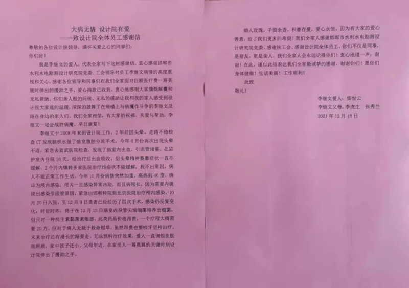 近日,设计院党总支和工会在全院范围内开展向重病职工李继文同志爱心捐款活动。