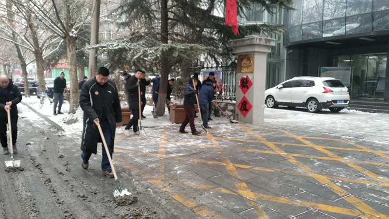 为保障我院职工出入单位安全,保持设计院外部环境整洁,我院于2月14日上午9时,组织职工对设计院楼前空地、门前公共道路及两侧人行道、院三楼平台的积雪进行清扫。